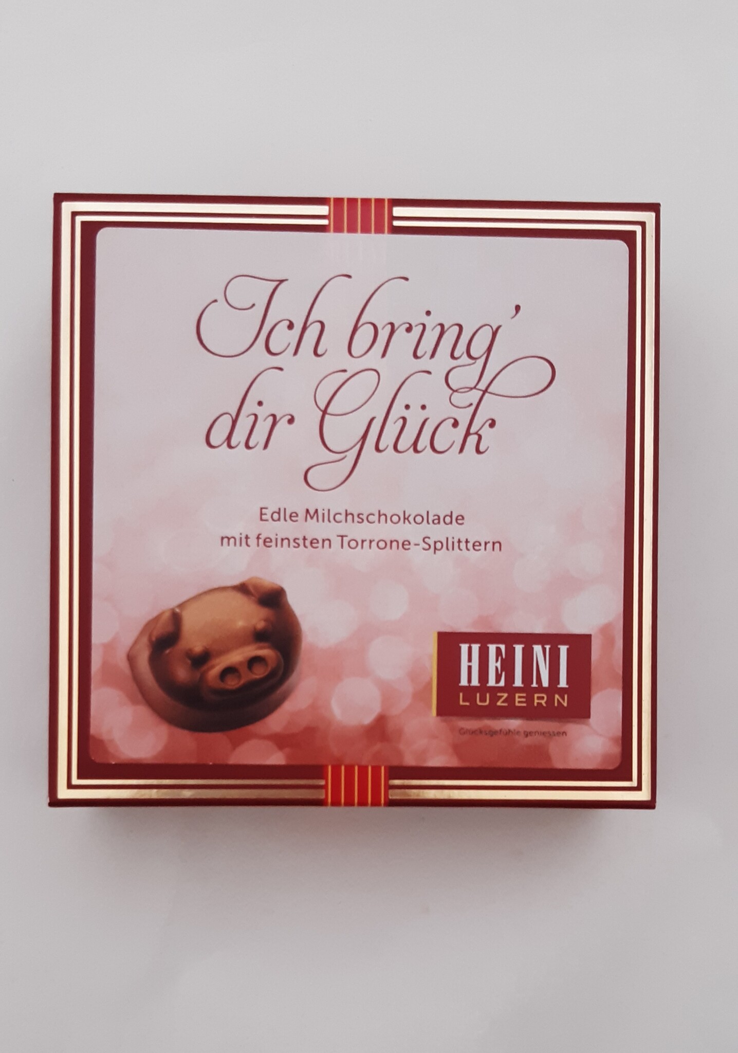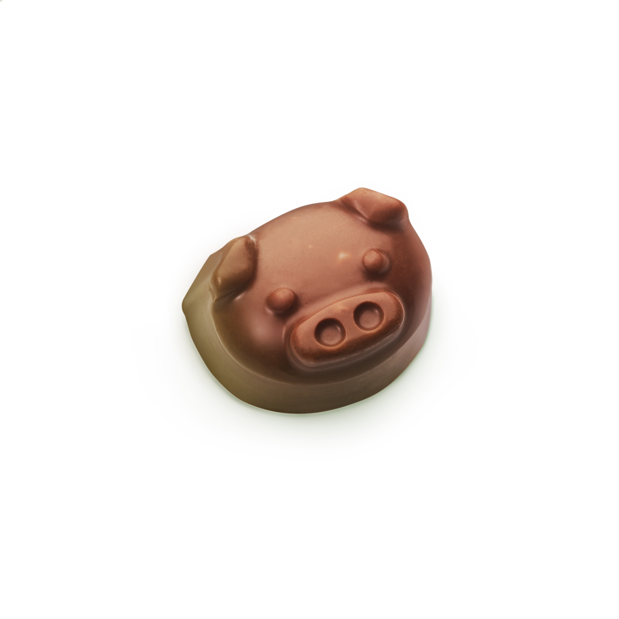 16 süsse Glücksschweinchen von Hand gegossen aus edler Vollmilchschokolade und mit feinsten Torrone-Splittern.