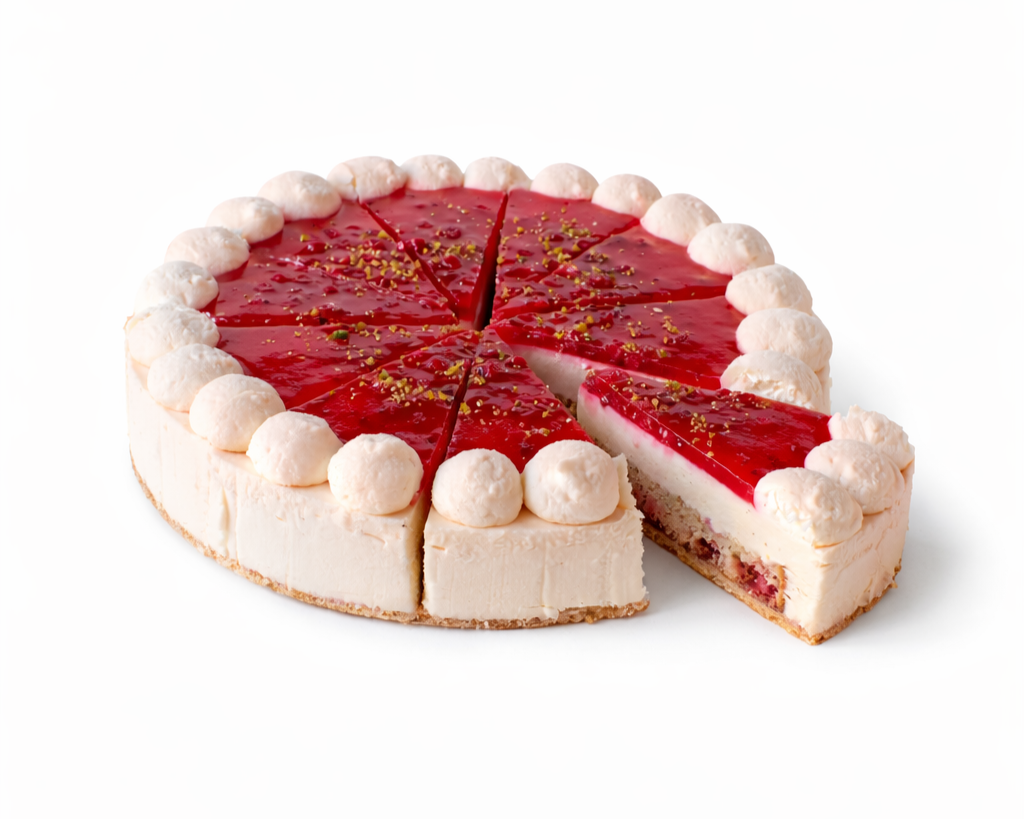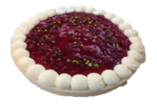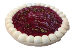 Beschreibung: Leichter Rahmquark auf Haselnussbiscuit abgedeckt mit einem Johannisbeer-Spiegel und Pistazien.