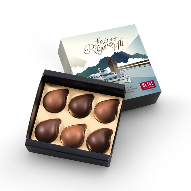 Tröpfli aus heller Vollmilchschokolade und dunkler Zartbitterschokolade. Wunderbar feine Schokoladentropfen, flüssig gefüllt mit «Chriesiwasser» von höchster Qualität und köstlicher Truffecrème. Die Tröpfli sind Teil des offiziellen Inventars «Kulinarisches Erbe der Schweiz».