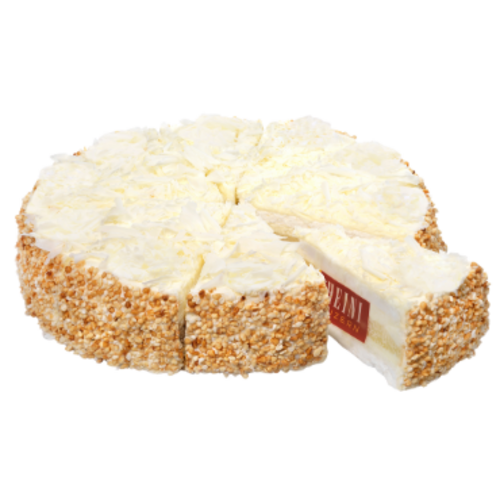 Beschreibung: Mit Kirsch getränktes Biscuit, umhüllt von einer Rahmcrème und bestückt mit Meringue. Ausgarniert mit weisser Schokolade und gepufftem Reis.