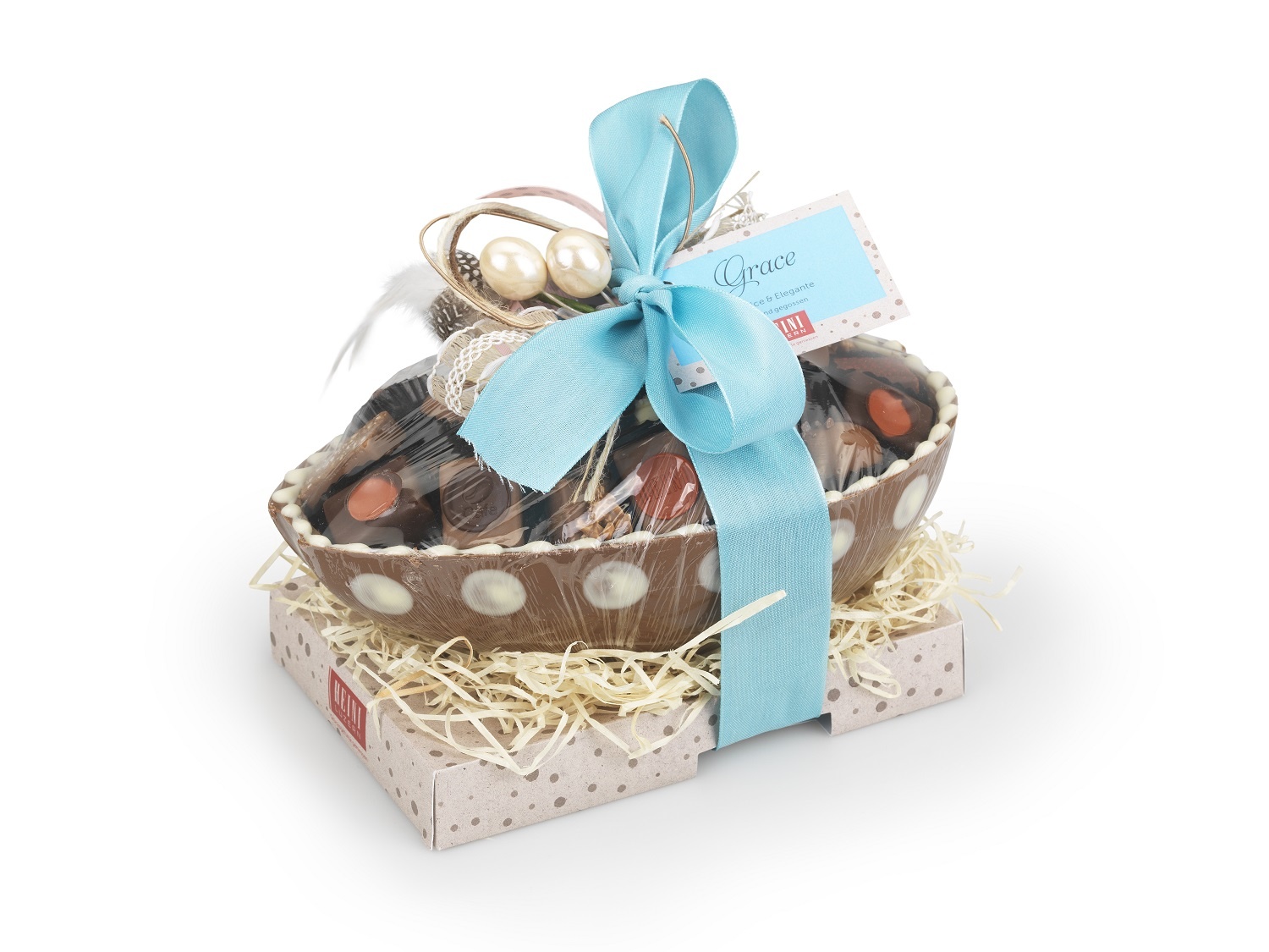 Osterei von Hand gegossen aus Vollmilchschokolade und gefüllt mit hellen und dunklen Lozärner Rägetröpfli. Eine Kombination aus bestem Chriesiwasser und Truffescrème.